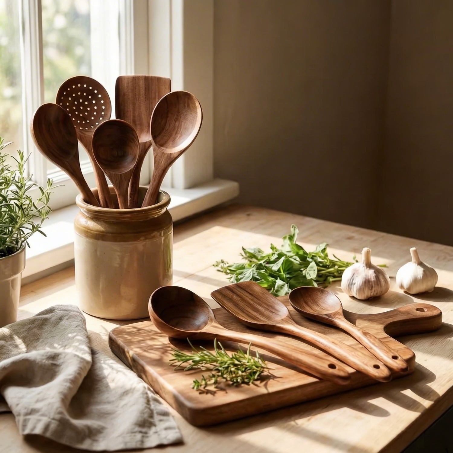 Unser skandinavisch designtes Küchengeschirr wird aus natürlichem Teakholz gefertigt und mit Olivenöl behandelt, um eine besonders lange Haltbarkeit zu gewährleisten.